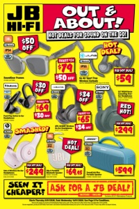 HOT DEALS FOR SOUND ON THE GO! SEEN IT CHEAPER? Excludes JB Hi-Fi Marketplace Products INSTORE | ONLINE $59 RED HOT DEAL! IP55 PLAYTIME! UP TO 32HR Go Air Sport True Wireless Earbuds 593716 / EBGAIRSPRTRBLK124 Ends 21/01/2026 HOT DEAL! $299 RED HOT DEAL! PLAYTIME! UP TO 50HR ULT WEAR Noise Cancelling OverEar Headphones 676951 / WHULT900NH Ends 21/01/2026 $249 RED HOT DEAL! PLAYTIME! UP TO 50HR Solo 4 Wireless On-Ear Headphones 676953 / MUW33PA/A Ends 21/01/2026 SMASHED! HOT DEAL! $69.95 RED HOT DEAL! IP67 WATERPROOF & DUSTPROOF PLAYTIME! UP TO 12HR Clip 5 Portable Bluetooth Speaker 751957 / 6142298 Ends 28/01/2026 Starts Thursday 8/01/2026, Ends Wednesday 14/01/2026. See Page 8 For Conditions. ^Discounts apply to previous ticketed/advertised price prior to the discount offer at the time of publication 6/01/2026. As we negotiate, products will likely have been sold below ticketed/advertised price prior to the discount offer. Prices may differ at airport stores. $65 $34 OFF^ TICKET $99 ATH-S220BT Wireless On-Ear Headphones 531071 / ATH-S220BT $34 OFF^ $69 $30 OFF^ TICKET $99 5.3 Push Play Active In-Ear Headphones 790190 / 253822 $79 $50 OFF^ TICKET $129 PLAYTIME! UP TO 8HR IP54 SoundGear Frames 751948 / 6077088 $50 OFF^ RED HOT! $599 IP67 WATERPROOF & DUSTPROOF PLAYTIME! UP TO 20HR SoundLink Max Portable Speaker 676968 / 883848-0020 OUT & ABOUT! PLAYTIME! UP TO 60HR $30 OFF^