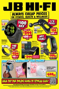 ALWAYS CHEAP PRICES ON FITNESS, HEALTH & WELLNESS! $699EA LED LIGHT THERAPY CryoGlow™ Cooling + LED Face Mask* 883533 / FW312ANZ Available Online & Selected Stores Only. For Availability Visit jbhi.fi/883533 $509 $90 OFF^ BIONIC GOLD TICKET $599 Ultrahuman Ring Air 809286 / UHRA-AG-05 Colours & Sizes May Vary By Store. For Availability Visit jbhi.fi/809286 $90 OFF^ $399INCLUDES 12 MONTH "PEAK" MEMBERSHIP. DEVICE REQUIRES ONGOING ANNUAL MEMBERSHIP OF $399° STRESS MONITOR TRACKING ADVANCED HEALTH BATTERY LIFE!• UP TO 14 DAYS WHOOP Peak 814068 / 973-004-000 Phone Not Included. Available Online & Selected Stores Only. For Availability Visit jbhi.fi/814069 Starts Monday 9/03/2026, Ends Sunday 22/03/2026. See Page 15 For Conditions. *Always Read The Label & Follow The Directions For Use. °See Page 3 For Conditions. ∙Battery life based on manufacturer testing and can vary significantly based on usage, feature configuration, settings and other factors. ^Discounts apply to previous ticketed/advertised price prior to the discount offer at the time of printing 25/02/2026. As we negotiate, products will likely have been sold below ticketed/advertised price prior to the discount offer. Prices may differ at airport stores. $399 $100 OFF^ 42MM TICKET $499 Vivoactive 5 Smartwatch 665844 / 010-02862-10 Started 1/03/2026, Ends 31/03/2026 $100 OFF^ CHECK OUT OUR ONLINE RANGE OF FITNESS GEAR! NEW CRYOGLOW NEW ™ FACE MASK! $114 $115 OFF^ TICKET $229 5 INTENSITY LEVELS 4 MASSAGE ATTACHMENTS Folding Therapy Massage Gun 589696 / FE-5862 Ends 25/03/2026 1/2 PRICE!^ $199EA ENDS 22/3! RED HOT DEAL! BATTERY LIFE!• UP TO 7 DAYS ACTIVITY & SLEEP TRACKER Charge 6 Fitness Tracker 662613 / CHARGE6-BLK(GA05183-AP) Started 5/03/2026 HOT DEAL!