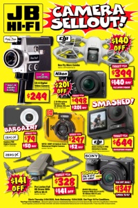 CAMERA SELLOUT! $249 CS-8 Digital Video Camera 888312 / CS-VC8-BK-WW 5 BUILT-IN VINTAGE FILTERS! JB EXCLUSIVE! $649 ADVENTURE COMBO TICKET $709 Osmo Action 5 PRO Adventure Combo 786705 / CP.OS.00000350.01 SMASHED! $79 $50 OFF^ TICKET $129 Explora FHD Digital Camera 709177 / ZX-DC100 BARGAIN! $1347 ENDS 15/4! RED HOT DEAL! A6400 Mirrorless Camera With E3.5-5.6/PZ 16-50mm OSS II Lens 795714 / ILCE6400KB BONUS $100 JB HI-FI GIFT CARD!† $297 $52 OFF^ TICKET $349 Starts Thursday 2/04/2026, Ends Wednesday 15/04/2026. See Page 19 For Conditions. †See Page 3 For Conditions. ^Discounts apply to previous ticketed/advertised price prior to the discount offer at the time of publication 27/03/2026. As we negotiate, products will likely have been sold below ticketed/advertised price prior to the discount offer. Prices may differ at airport stores. Z 30 Mirrorless Camera With 16-50mm VR Lens 660797 / VOK110UA $998 $201 OFF^ TICKET $1199 $328 $141 OFF^ TICKET $469 Pro Levion Full HD Drone With GPS & Wi-Fi 656156 / ZXP-DR3 $141 OFF^ $399 $140 OFF^ FLY MORE COMBO TICKET $539 Neo Fly More Combo 782313 / CP.FP.00000185.03 $140 OFF^ $201 OFF^ WPZ2 16MP 4X Optical Zoom Waterproof Digital Camera 653250 / WPZ2YL